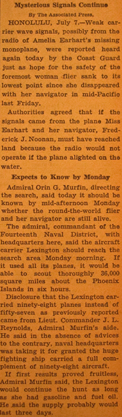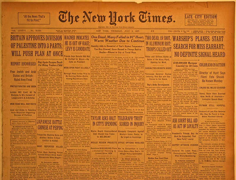 On her round-the-world flight, female aviator extraordinare Amelia Earhart’smonoplane vanishes over the Pacific Ocean after radio contact with her abruptly ceases. In spite of a thorough search of a huge amount of ocean, and amongst endless speculation and rumors, nary a trace of the intrepid aviator, her navigator Fred Noonan, or her plane will ever be found. The Times front page report says the search has begun over a large area, and that her husband hopefully believes she may still be found in the area below the Howland Islands.