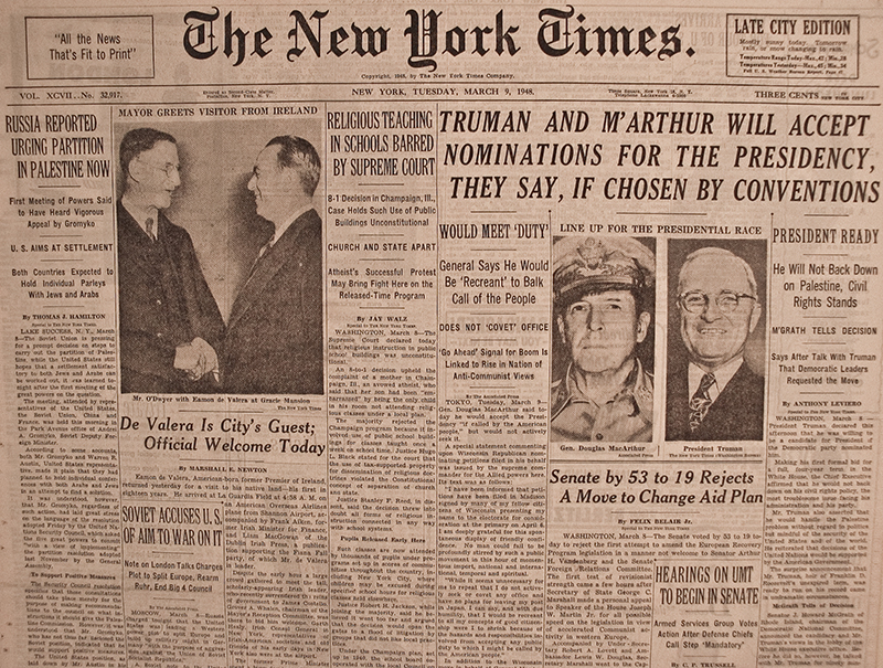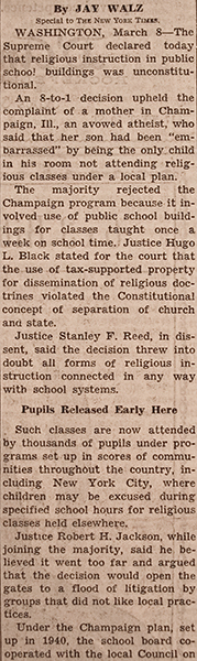 A front page three-column headline announces, “HIGH COURT BANS PRAYER IN SCHOOLS.” Subhead clarifies: “Ruling Goes 8-1 Against Prayer, Bible Reading.” The historic report begins: “In a sweeping 8-1 decision, the Supreme Court Monday banned as unconstitutional any required use of the Lord’s Prayer or Bible reading in public schools for devotional purposes. The long awaited ruling….charged that such religious exercises violated the First Amendment which prohibits governmental “establishment of religion.” (The ruling came about owing to a case of Madalyn Murray O’Hair (not mentioned in the report), a militant atheist, who filed a lawsuit against the Baltimore School Board. After the Maryland Court of Appeals ruled against her, the case went to the Supreme Court ending with this still-controversial decision).